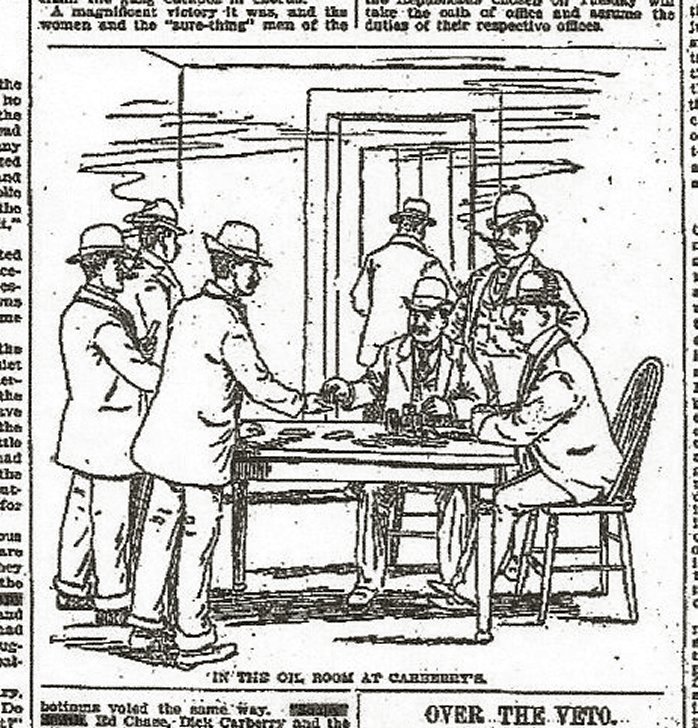 | IN THE OIL ROOM AT CARBERRY'S Repeaters get their names to vote under Rocky Mountain News, April 4, 1895 |